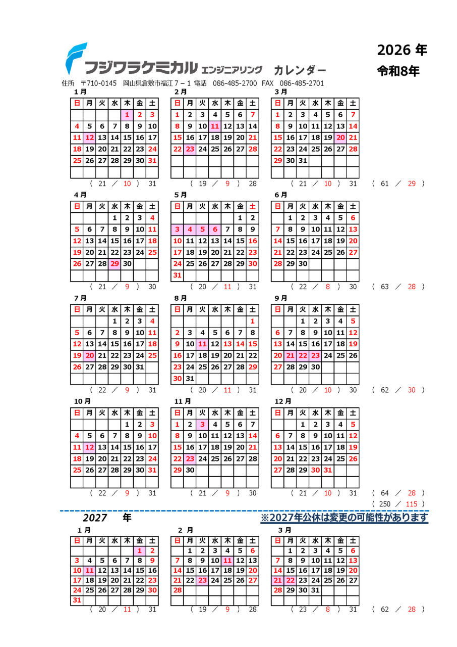 2026年4月17日2026年4月18日 会社情報 平素は格別のご高配を賜り、厚く御礼申し上げます。取引先様への利便性向上、および求職者様への情報公開のため、最新の会社カレンダーを公開いたしました。 来社予約やスケジュール調整、また弊社の休日体系の確認にご活用ください。 2026年度 会社カレンダーダウンロード(PDF形式) URL Copied! 技術情報メルマガのご案内 受信箱に届く5分の学び 技術情報メルマガでは、週2回、プラスチック加工に関する実践知識を配信します。新着コラムや人気記事のピックアップに加えて、素材選定・加工技術・製造事例など、 現場で役立つ情報を効率よく収集できます。ご登録無料。いつでも解除可能です。 <主な配信内容> プラスチック加工の技術情報 素材特性や選定のポイント 実際の製造事例・トラブル解決事例 最新の加工技術情報 素材特集や業界特集などの月刊特集 展示会出展情報 必須メールアドレス 必須会社名 必須名前全角文字で入力してください。 「個人情報の取り扱い」に同意の上でお進みください。 同意する このフィールドは空のままにしてください。